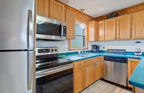 As you step inside, you'll be welcomed by a beautiful great room filled with coastal touches, a ceiling fan for comfort, and lots of natural of light shining in from the windows. The single-level open style floorplan makes it easy for families to spend time together throughout the whole day. The cozy living area features a plush sofa situated around a wall-mounted Flat Screen TV perfect for catching up on your favorite show or watching a movie during a rainy evening. The spacious kitchen offers plenty of prep space and is stocked with stainless steel appliances and everything else you might need to whip up a delicious meal at home. The adjoining dining area has seating for 4 and doubles as a great spot to pull out your favorite board game for some family friendly competition.