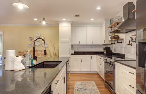 Each bedroom offers comfort and convenience, with the primary suite featuring a soaking tub and large tiled shower. Additional bathrooms ensure a smooth morning routine, while a full-size washer and dryer make longer stays easy. Meanwhile, the kids will love the rec room, stocked with arcade games, a shuffleboard table, and cornhole, or they can hang out by the wood fire pit or garden swing under the stars.
