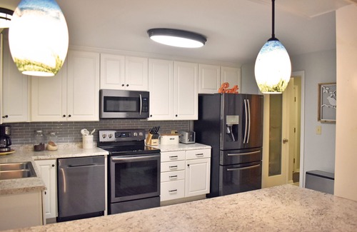 MAIN LEVEL: Daydream Inn features an open floor plan with Great Room, fully equipped updated Kitchen, Dining Area table with 4 chairs plus Breakfast Bar with 2 additional seats. Great Room has gas fireplace (Oct 1- May 1), Smart TV comfortable seating. Great Room, Deck and Screened Porch overlook Bald Mt Lake and private dock. Gas grill on the deck (propane supplied). Screened porch dining table with seating for 6. Master Bedroom has 1 Queen bed, large Smart TV and private Bath with walk-in shower. Bedroom 2 has two Full size beds, Smart TV and Bedroom 3 has two Queen beds with Smart TV, share a Jack-n-Jill Bath with combination tub/shower. 3rd full newly remodeled Bath is located adjacent to the Kitchen. Easy access from a large drive and paved parking area to Main Entrance. Parking for 3+ vehicles.