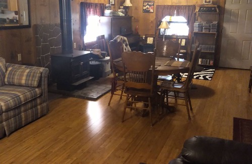 This is a 900 sq ft private home with cabin appeal. Full power, wood stove, a creek across the street, and peace and quiet. One large king bed, a pull-out sofa bed, and options for sleeping air mattresses. ViaSat Basic Internet. Not good for streaming movies (Netflix), but does audio fine. Verizon gets a bar or so, enough for texting. Well and sewer. This is not off the grid, just secluded. This is a private home with private items displayed, we are offering it as a vacation rental, outside of friends & family, for the first time in a decade. If you want a cozy environment, this is the spot.