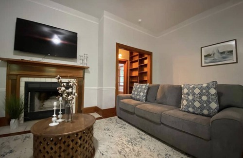 Upon entering the home, you'll immediately notice the stunning high ceilings. This home is a great place for socializing with three common areas to gather with your friends and family. The living room features a large sofa, 2 sitting chairs, and a rocking chair. All surrounding an original fireplace and a new, wall-hung 65-inch Smart TV with Netflix. Moving towards the middle of the home, you'll find a beautiful dining room table with seating for eight.