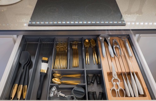 The designer kitchen has fully integrated Siemens and Bosch appliances, full size dishwasher, fridge, freezer washer/dryer, Induction Hob Touch screen Oven, Microwave/Steamer, plate warming drawer, even a wine cabinet!