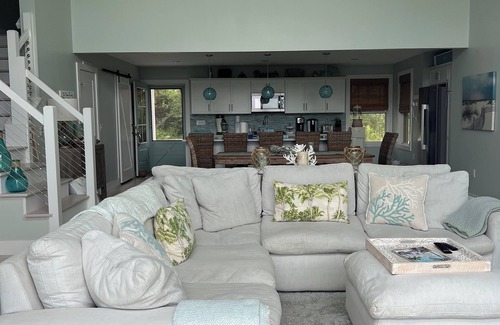 New home on Rays Bay Lake Ontario with stunning West facing sunsets. 3 bedrooms (1 king master ensuite, 2 bedrooms with queens in each and shared bathroom.) and an open upstairs loft open to below that has 2 sets of twin above double bunk beds with lounge area. Many amenities, lots of privacy on 2 acres, and large waterfront. Outdoor patio facing lake with firepit including firewood, seating area, table and umbrellas. Waterfront deck with Adirondack chairs and umbrella. Porch with seating on non-lake side. Guests are welcome to use 4 kayaks, paddleboard and bikes. Plenty of parking for 6 cars and a boat if you choose to bring yours to use. The boat launch is 5 minutes away/2 miles (there is no dock for your boat). We also have yard games such as cornhole, ladderball and horseshoes and indoor board games. Wifi is available and a smart tv in great room. Kitchen is fully equipped with gas range, 2 refrigerator freezers, keurig and regular drip coffee maker, toaster, frozen drink blender, dishwasher and water cooler (5 jugs, 5gal each). Indoor dining table that seats 8 and 5 counter stools at kitchen island. Outdoor table that seats 8.