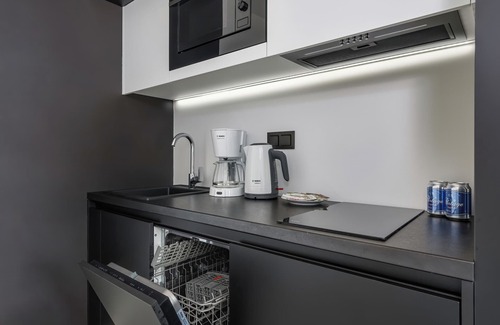 The living space consists of an entrance hall, living room with kitchenette, bedroom and bathroom with shower and toilet. In addition, the living room comes with a private balcony, where you can take in the fresh coastal air and enjoy a sip of aromatic morning coffee. A spacious living area with a sofa bed and TV provides the perfect place for rest and relaxation, as well as a bedroom with a comfortable double bed in the bedroom. The room also has access to a furnished balcony. Guests can use the high-speed free Wifi connection. The kitchenette is equipped with high-quality household appliances to prepare your favorite meals. The unique decor and comprehensive equipment with necessary kitchen and bathroom accessories guarantee a comfortable stay. The apartment is equipped with basic amenities such as an iron, ironing board, vacuum cleaner and hair dryer. A complimentary set of toiletries (soap, shampoo and shower gel), towels and linens are provided to help start each stay. The property is equipped with everything you need to relax. Functional, tastefully decorated space in classic white, gray and black, makes the apartment elegant and has a unique, peaceful atmosphere.