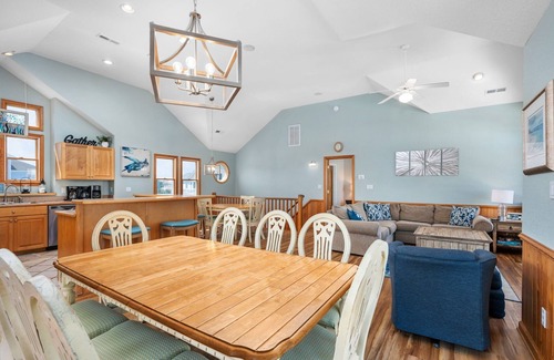 The third floor offers a spacious great room with a plush couch, large TV, sun decks to relax on with a morning cup of coffee. The kitchen is perfect for family meals, with a dining area that has seats everyone. There is also a bedroom with a king bed and private bath and deck access. Outside, enjoy the heated pool, hot tub, and charcoal grill. Located in the Ocean Lake neighborhood at the northern end of the Ocean Sands Community, Ships Ahoy is less than a 5-minute walk to the beach and close to shops and restaurants. Ships Ahoy is your ideal OBX getaway!