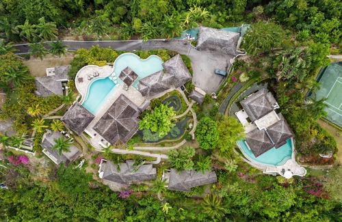 This award-winning Jamaican holiday home is distinguished by world-class architecture, design and decor, breathtaking location, and exquisite accommodations and service. This luxury villa rental includes the gracious staff of 16 who will cater to your every need. Silent Waters Villa is selected, perhaps more than any other private villa in Jamaica by brides for a destination villa wedding. Silent Waters is located on one of the highest hilltops overlooking Montego Bay and the Caribbean Sea. The site consists of 16.5 acres, secured with a sophisticated electronic security and video system - twelve buildings, helicopter pad, private tennis court and two swimming pools occupy five acres. A total of seven villa bedrooms (7 air-conditioned bedrooms) accommodate as many as 16 guests. With the addition of the Master Suite private villa (2 air- conditioned bedrooms) up to 20 guests may be accommodated. Each bedroom has its own patio with chaise lounges for sunning and relaxation, all sleeping rooms have their own air conditioner and ceiling fans, wet bar, telephone, stereo system, high speed wireless Internet service, and television. There is a 60" 4K TV in the main pavilion and a state of the art audio system in the pool area with 16 powerful speakers with large sub-woofer. The entire property is rented to only one party of guests at any given time, thereby providing complete seclusion and privacy for the guests.