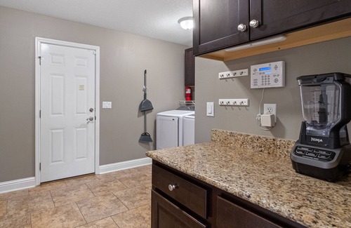 The open living area welcomes group gatherings with a plush sofa and 65'' smart TV, while the private home office has a desk, chair, computer monitor, wireless keyboard, and mouse for remote work needs. The kitchen boasts a full suite of stainless steel appliances and plenty of counter space, including a floating island prep table, for planning at-home meals with ease. The kitchen and dining room tables each feature generous seating arrangements for dinners and game nights. Home essentials include central air-conditioning, free WiFi, and a private washer/dryer.
