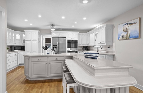 The bright, fully stocked kitchen is a chef’s dream, featuring all new appliances, including a double oven, microwave, and refrigerator. The large island comfortably seats three, making it the perfect spot to sip on cocktails while the chef prepares meals. Off the kitchen is an eat-in dining area with a table for 8, where you can enjoy your meals while soaking in beautiful lake views.