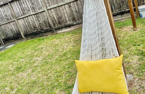 Make our beautiful bungalow your home base while in Houston. With 2 queen beds and a sofa bed, two bathrooms, and a porch with a view of the city skyline, this house in the Arts District will serve you well while visiting H-Town. Thank you for considering making us a part of your trip!