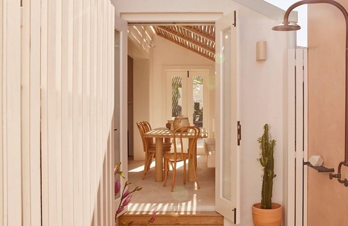 The main entertaining spaces of this house offer laid-back living at its finest. A low natural sofa lounges below striking original artwork, inviting you to sink in, relax, and catch up around the marble coffee table or cosy up In front of the fireplace. Let in a light breeze blow over the living space via the adjacent patio doors; throw these open and enjoy the best in alfresco living in the perfect garden for entertaining. Complete with a BBQ, outdoor seating and an outdoor shower enclosed in chic terracotta walls, the garden is a boutique space ready for long summer days relaxing and rejuvenating. When the evenings get darker, move indoors for leisurely meals served with local wines. Sit around the dining table which is embraced in a shaded alcove beneath a wooden baton ceiling. The kitchen flows through from the main living space, fully equipped with top-of-the-line appliances and everything you need to whip up gourmet meals and BBQ salad delights.