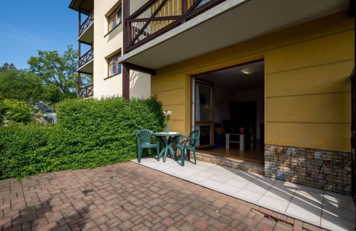 "Sluneční stráň II", 2-room apartment 46 m2, on the ground floor. Spacious and bright, comfortable furnishings: living/sleeping room with 1 double sofabed and satellite TV. 1 room with 1 double bed. Kitchenette (2 ceramic glass hob hotplates, toaster, kettle, microwave) with dining table. Shower/WC. Terrace. Terrace furniture. Facilities: Internet (WiFi, free). Parking space n 317/5. Please note: suitable for families. Non-smokers only.
