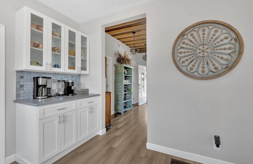 While exploring all that Bristol has to offer, return to the serenity of our private backyard oasis. Enjoy a soak in the hot tub, gather around the cozy fire pit, or dine outdoors under one of our many seating areas, including a covered space. Challenge each other to a friendly game of ring toss, as well.