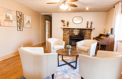 Forget your worries in this spacious and serene cabin on 9 acres. There are currently 6 bedrooms, 3 full bathrooms and one half bath. Outdoor amenities include a large wrap around deck overlooking the forest, grill, fire circle, and NEW HOT TUB! Enjoy hiking to waterfalls and caves, ziplining, kayaking or canoeing, golfing and other outdoor activities in an easy 10-30 min driving distance.