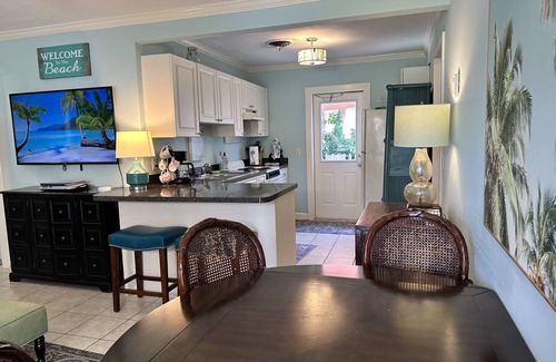 Dolphin Cottage has 3 bedrooms; 1 King Bedroom, 1 Double Twin plus Trundle Bedroom, and 1 Studio Apartment Style Ensuite 2 Bunk (4 Twin) Bedroom with Kitchenette. It also boasts 2 full bathrooms (1 with bathtub), several good size living and dining spaces, one main kitchen and one kitchenette. The home offers easy beach access just steps from the front door. Take the beach chairs and umbrellas on the beach cart provided at Dolphin Cottage, walk across the street and onto the boardwalk through the mangroves to the beautiful tropical white sand beaches at South Beach Park!