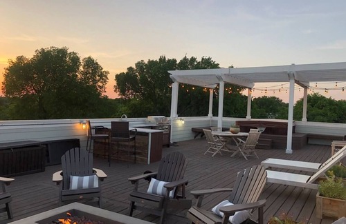 This exquisitely designed home has a style all its own. Discover a space that is at once in the city yet in the midst of nature & serenity. This home features an open-plan layout, neutral tones, contrasting wood finishes, wraparound balconies, and ultimate rooftop space complete with a hot tub, fire pit, and outdoor kitchen. 6 beds + [1 Q air mattress] & 4 full baths available. 2.5 miles to downtown! Escape into nature, explore Broadway, come get inspired!