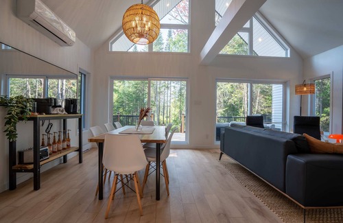 Chalet LAUM comfortably accommodates up to 4 guests. Located at 2327 Chemin du Lac-Canard, Sainte-Lucie-des-Laurentides, it combines rustic charm, modern comfort, and a warm atmosphere in a beautiful natural setting.