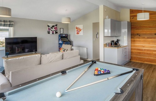 This contemporary, pet-friendly two-bedroom lodge is a great place to enjoy a relaxing stay with stunning views. The master bedroom has a king-size bed, Smart TV and en suite shower room. One twin bedroom, a family bathroom with overhead shower. The spacious and modern open-plan living/dining/kitchen has floor to ceiling windows and is the perfect place to socialise. Enjoy movie nights in front of the 55 inch Smart TV, whilst others play on the combined pool table/table tennis/diner. If that’s not enough the retro arcade machine with 100’s of classic games is a fun alternative and a real throwback. French doors lead out to uninterrupted field views from the private raised decking area with rattan sofas and an outdoor hot tub. Step down to the securely fenced grassy area ideal for your pooch which includes a BBQ stand and picnic bench. Festoon lights complete the outdoor space creating the perfect evening ambience. Parking available outside the lodge. Pets accepted (surcharge applies).. Hoseasons’ Best In Britian Award 2024 Winner – Large Park.