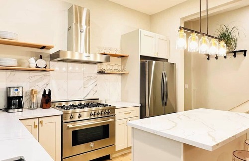 The main floor includes 5 bedrooms, a kitchen, a living room, and a dining room. Each bedroom has comfy bedding and plenty of storage space for your items. The kitchen is fully equipped with all of the equipment and appliances you'll need to prepare meals during your stay. After a day of visiting the city, there is plenty of space in the living area for everyone to rest and decompress.