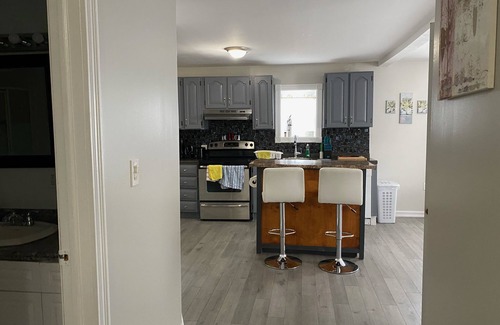 Relax in this spacious home steps away from skiing and skidoo trails. Just minutes to the Stephenville Airport. Full house access with in house laundry facilities. Relax in the living room and enjoy the full kitchen, stocked with cooking and dining necessities. There is an open dining room and on site parking.