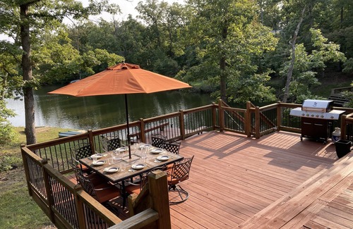 Take in the incredible views of the lake from the expanded newly replaced deck with large outdoor dining table, BBQ grill and covered seating area. The back yard provides level access to a private lakeside dock, fire pit and private beach area. The canoe, kayaks, paddleboat and stand-up paddle board are available for your private use. Enjoy swimming, boating, horseshoes, fishing or sandcastle making right from your own backyard. Paddle around the lake to discover Grendel's family friendly neighbors, the island or enjoy a relaxing afternoon on the deck. Enjoy the abundant wildlife and early morning visits from deer. Whether you are looking to spend a quiet week in the woods or explore all of the adventures that Innsbrook has to offer, this is the perfect spot. Innsbrook's amenities include beautiful hiking trails, horse stables, championship golf course, tennis courts, large community pool in the summer months, Clubhouse bar and grill and so much more.