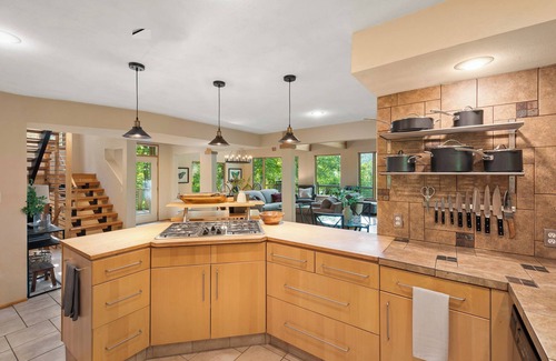 Outside, there is a wrap around deck for outdoor dining and relaxing, and a firepit with seating. The property provides plenty of space for hiking and exploring - including seasonal waterfalls, creeks, and trails.