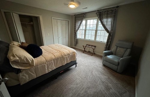 Downtown Hannibal offers lots of restaurants and shops, ghost tours, a trolley, winery and live music in the summer. Something going on almost every weekend, this is a great retreat area that feels like a Hallmark movie. Home offers outdoor spaces with an easy walk to Historic Riverfront Park where you can wander trails to the Mississippi River, then return and enjoy rocking on the front porch or a relaxing soak in the hot tub with private views of the woods. There are two large living rooms with Roku TVs, three separate master suites also have Roku TVs, a large eat-in kitchen fully operational for making a family meal (basic dry goods onsite for guest use), outdoor decks and screen room with basic gas and blackstone grills. Full dining room, lots of hangout and game spaces. Main floor master has dedicated office space, WiFi thoughout the home, printer and scanner accessible. Onsite parking and a fenced yard for your pet.