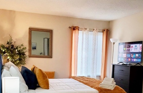 Primary bedroom has queen size bed memory foam medium 14 inch mattresses. Second bedroom has twin beds with medium memory foam mattress and a smart tv, ready for you to log into your favorite streaming service. Free tv channels are available thru Vizio tv. (cable not provided)