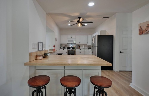 Welcome to the Modern Farmhouse on Walton – a newly renovated 4-bedroom, 2-bath home offering 2,000+ sq ft of stylish comfort in Alexandria Bay. If you’re traveling with a large family or a group of friends, this is the perfect home base: it’s huge, modern, and designed for togetherness. Tucked on a quiet street only a 10-minute walk from downtown’s shops, restaurants, and riverfront, our farmhouse gives you both space and convenience. Inside Space – Open, Airy & Comfortable: Step into a bright open-concept living area with vaulted ceilings and lots of natural light. There’s ample seating on the comfy sofas (all new in 2023) where your group can lounge and stream movies on the flat-screen smart TV. The adjacent dining area has a large farmhouse table where you can share meals as a group of 8-10. Our fully equipped kitchen is a chef’s delight – all-new stainless appliances, a coffee maker + nespresso, and cabinets stocked with cookware, bakeware, and spices. Whether you’re cooking a big breakfast or shaking up evening cocktails, you’ll have everything you need. We even include a starter supply of coffee and pantry basics. Off the living room, there’s a bonus game room/den featuring a game table, board games, and kids’ toys – a great hangout spot on a rainy day or a dedicated workspace for remote workers who need a quieter corner (free high-speed Wi-Fi reaches throughout the house). Bedrooms & Baths – Room for Everyone: With 4 bedrooms, everyone can sleep comfortably. Each bedroom is uniquely decorated and comes with plush bedding and room-darkening curtains for a good night’s rest. Three bedrooms feature queen beds (no fighting over who gets a real bed!), and the fourth bedroom is a fun bunk room – it has a twin-over-full bunk plus full futons, ideal for the kids or additional guests. (In total, the house can sleep up to 12 when utilizing the futons – perfect for multi-family groups.) Both bathrooms have been fully renovated with modern fixtures; one offers a tub/shower combo (great for bathing little ones) and the other a step-in shower. We provide plenty of fresh towels, a starter set of toiletries, and a hairdryer in each bath for your convenience. Outdoor Oasis – Large Yard & Patio: One of the highlights of this home is the huge fenced yard– a rarity this close to downtown! Step out the back door to find a patio with outdoor dining furniture and a BBQ grill ready for summer cookouts. Sip your morning coffee on the patio’s bistro set, or enjoy an evening cocktail while the kids play tag in the yard. There’s also a fire pit with seating – roast marshmallows under the stars and share stories after a day of adventure. The yard is private , giving you a peaceful place to unwind. Location & Nearby Experiences: Although you might feel tucked away, you’re actually walking distance to Alexandria Bay’s main attractions. Stroll 5 minutes and find yourself at James Street with its quaint boutiques, ice cream stands, and taverns. The famous Boldt Castle boat tours depart nearby – you can walk to the dock or drive 2 minutes. Scenic View Park (with a playground and small beach area) is also a short walk away, so you can easily have a picnic by the river. Our guidebook at the house points out our favorite local restaurants (don’t miss the fish fry!) and day trip ideas – from winery tours to exploring neighboring Thousand Island Park. Whether you spend your days boating, fishing, touring castles, or even working remotely from the porch, you’ll love coming back to the Modern Farmhouse to relax. *Group-Friendly Amenities: We’ve tried to think of everything to make large group stays comfortable. You’ll have parking for 3-4 vehicles in the driveway. Laundry is easy with a washer/dryer on-site (pack light!). The house is equipped with AC and heating for year-round comfort. For families, we provide a pack ’n play, high chair, and children’s dinnerware. Fast Wi-Fi and multiple smart TVs mean no fights over what to watch. Plus, entry makes check-in a breeze for everyone in your group. (Please note: for the comfort of all our guests, this home is smoke-free and pet-free.) This Modern Farmhouse combines historic charm (spacious rooms, original hardwood floors) with modern updates and thoughtful touches from hosts who truly care. Our recent guests have loved how “spacious and clean” the home is and how the renovations inside are top-notch. We are continuously improving the exterior and landscaping so that the curb appeal matches the lovely interior – we take pride in providing an all-around excellent experience. Book your stay with us and enjoy the perfect blend of comfort, style, and Alexandria Bay adventure – we can’t wait to host your group!