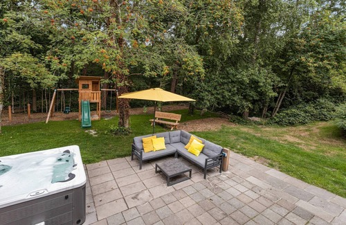 This comfortably furnished family and friends home lies at the edge of the forest in Vlagtwedde, offering a peaceful setting designed for shared moments and outdoor enjoyment. The sunny, contemporary house is both practical and inviting. On the ground floor, you'll find 2 bedrooms and 2 bathrooms, while upstairs features 4 additional bedrooms, two with balconies, and 2 more bathrooms, providing space for up to 12 guests. The heart of the home is the large open kitchen with a generous cooking island and two dishwashers, making group meals a breeze. After a day exploring nature, relax in the private 5-person outdoor spa, or unwind in the Finnish sauna with light therapy and infrared heaters. The property even includes a private forest path, inviting you to enjoy walks in total privacy. The sunny forest garden is a true haven, equipped with a spacious terrace, a luxury lounge set, sunbeds, picnic and bar tables, and a Boretti charcoal barbecue. Children will love the mini playground and outdoor games like Jeu de Boules, while active guests can enjoy 2 available SUP boards. There's even an extra fridge-freezer in the storage room. Located near scenic walking, cycling, and fishing areas, and close to the German border, this home is perfect for a relaxing and active group getaway.
