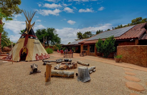 Great place to relax with your family and friends. A lot of 'Old West' charm and perfect home base for exploring Las Vegas and surrounding area. The large garden is great for lounging, and includes a pool and spa, koi pond, firepits, and a large tipi.