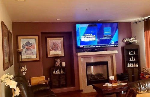 Upstairs is a grand room for 1 to 12 guests with a big screen smart TV, 4 full beds, and lounge easily converted to 1 queen framed futon & 1 queen futon pad.