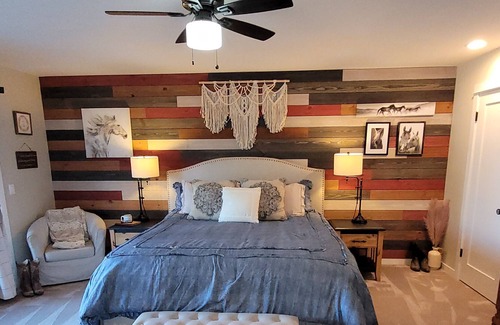 Keep on down the hall is where you will find "Guest Bed 2", another queen sized Puffy bed with a woodsy shiplap wall and cabin chic bedding, tranquilly decorated with a peaceful vibe.