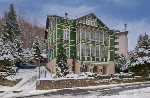 Cosy, rustic apartment house "Stříbrný pramen", detached. In the resort, 200 m from the centre, in a sunny position, 500 m from the skiing area. Private: pergola (10 m2). In the house: central heating system. Linen change (suppl. charge extra). Towel change (suppl. charge extra). Room cleaning on request (extra). Parking at the house, public parking extra. Grocery 300 m, restaurant 50 m, bus stop "Janské Lázně - Lesní dům" 300 m, railway station "Svoboda nad Úpou" 3.3 km, park "Farmapark Muchomůrka" 1 km, outdoor swimming pool 7 km, indoor swimming pool, thermal baths 400 m. Tennis 1 km, minigolf 400 m, cycle lane 100 m, cable car 600 m, ski lift 300 m, chair lift 500 m, gondola lift 600 m, slopes, ski rental 300 m, ski school 400 m, children's ski school 300 m, sled run, cross country ski track 700 m. Nearby attractions: Lanovka na Černou horu 600 m, Janské Lázně Spa, Stezka korunami stromů 1 km, bobová dráha 5 km, Pec pod Sněžkou, Relaxpark, bobová dráha 11 km, Vrchlabí 10 km, Trutnov 12 km, Malá Úpa 15 km, Zoo Dvůr Králové, Adršpach 35, Karpacz 40 km. Well-known ski regions can easily be reached: SkiResort ČERNÁ HORA - PEC, Mladé Buky 5 km, Horní Malá Úpa 16 km, Špindlerův Mlýn 30 km. Hiking paths: krkonošské naučné stezky. Please note: no lift. The owner lives in the same residence. The apartment is located in a zone with limited traffic.