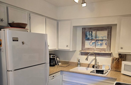 2. The kitchen has a quartz countertop, with all appliances and dishes needed including a blender, food chopper, coffee machine, french press, coffee grinder, casserole dishes, plenty of pots and pans, baking sheets, measuring tools, etc.