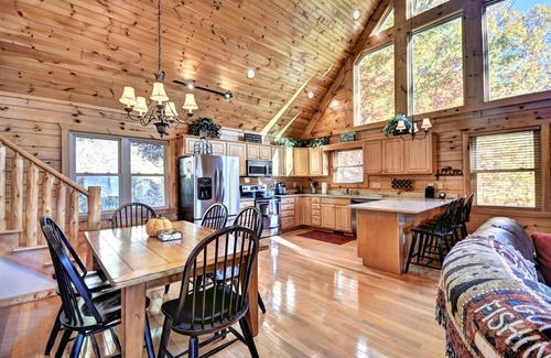 Enjoy the Smoky and Blue Ridge Mountains in a beautiful luxury log home, on 1.4 wooded acres, where you can relax in a private and tranquil setting, enjoying spectacular mountain views, wildlife, nature and amazing sunrises, just minutes from hiking, golf, restaurants and shops. With an elevation of 3700’, beauty can be seen from its many windows and large porch area where you can enjoy the views in the comfort of the rocking chairs, while unwinding in the hot tub in the adjoining gazebo, or from the fire pit, where you can make s’mores and your enjoy favorite libation.