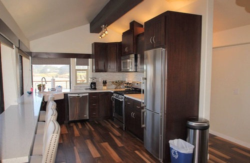The second level is an open concept featuring a kitchen, an eat-in countertop with an ocean view, and a living room with flat-screen TV large all with stunning views of the pacific. Also, on this level, there is a custom queen-size Murphy bed that still allows ample space in the room when down.