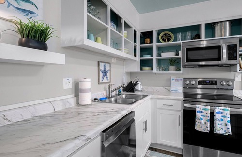 This unit features a dishwasher, stackable washer & dryer, updated kitchen appliances and a powder room half bath! The Cottages at Pier 35 evoke an era of coastal living of the past with its Cape Cod inspired shingled facade, generous lawn, sundeck pier - all with gentle ocean breezes and swaying palm trees. Enjoy the laid back lifestyle in this lovely ground level canal front cottage style condo home. Easily accessible with only four stairs and a front porch offering wonderful up-close views of the canal. A peaceful use in common yard features a canal side seating area for relaxing and breathing in the salt air. Enjoy crabbing or fishing on the canal and the convenience of a charcoal grill area overlooking the water. Inside the home you will find a lovely living area and a charming kitchen with unique nautical details, a dining island, new full sized stainless refrigerator, range, microwave and dishwasher. Each of two bedrooms feature plenty of natural light and a convenient en-suite vanity with sink. Convenient outdoor shower with hot and cold water. There is parking available for two cars per unit and convenient beach access is just a 3 minute, 1/10 mile walk away. "Starfish" is the perfect choice for a couples retreat or an affordable beach getaway for a small family. Need more room to spread out? Rent this unit along with one of our sister properties, "Porpoise" or "Sand Dollar".