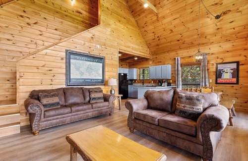 Starry Nights is a beautiful three-bedroom cabin located in Mountain View Court. This charming cabin gets its name from the spectacular night sky guests can enjoy from the cabin's decks. Starry Nights sleeps 10 guests with three king beds, two queen sleeper sofas and three bathrooms. The large stone fireplace is the heart of the living room. Guests can enjoy the warmth and comfort of the fire's glow as they relax on the couches and watch their favorite movie. The full kitchen allows guests to prepare delicious home-cooked meals. Kids can play a friendly game of ping pong in the game room and adults can enjoy their evenings with a relaxing dip in the outdoor hot tub. Starry Nights offers guests breathtaking views of the Smoky Mountains right from the deck as they relax in the rocking chairs or swing. Starry Nights is only six miles from Dollywood theme park and Dollywood's Splash Country water park. Also, this cabin is only minutes away from other area attractions in Pigeon Forge and Gatlinburg.