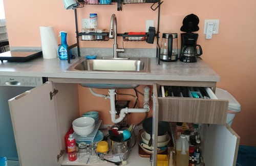 The space includes a comfortable bedroom and living area, both with A/C. The kitchenette features a microwave, dorm fridge, hot plate, kettle, sink, and dishwasher — everything you need to enjoy meals at home (note: no oven).