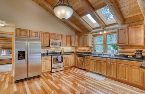 Upon entry, you are greeted by honey-toned wood throughout the home in a classic “pioneer cabin style”, while vaulted ceilings and plentiful windows create warmth and brightness. Directly to your right is the first bedroom featuring a Twin over Full Bunk Bed and plenty of space to play.