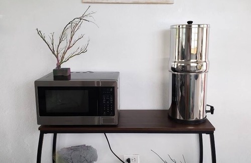 This 2 bedroom, 1 bathroom, full kitchen, dining and living area house will be your hub while making the most of your visit. Enjoy the backyard with a covered terrace, outside sitting area, grill, games, screened gazebo, outside shower, a beautiful mural from a local artist and soon- a small pool! We highly recommend this property for 6 guests (adults, young ones, or kids). We have a high quality full-size futon , perfect for 2 kids, young people, and small adults.