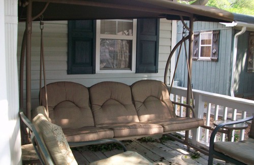 OUTSIDE at the deck is a grill, table, chairs, and a swing for your comfort.