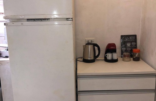Full kitchen: Refrigerator, microwave, 2-burner stove, electric kettle, coffee maker, sandwich maker, crockery and pans;