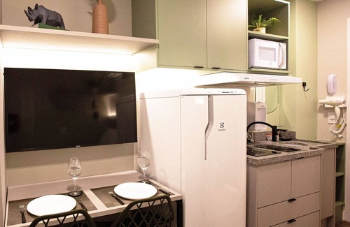 Studio Apartment with 13m², equipped kitchen, gas shower, high-speed internet, smart TV, coffee maker, humidifier, water filter, single bed with air conditioning, microwave, space for home office or study, refrigerator and hair dryer. An intelligent space that balances functionality and style to offer comfort and convenience.