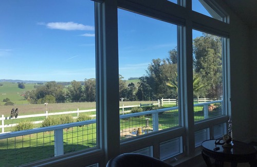 You drive through the Pearly Gates, up a eucalyptus grove to the main house. The main house includes 3 bedrooms. We have a large king bedroom, cozy full and queen bedrooms. This gorgeous property also offers WiFi, a laundry room with a full size washer and dryer, a gourmet kitchen, and wall to ceiling windows to look out over the east Petaluma mountains. We have a wrap around porch and BBQ for your use.
