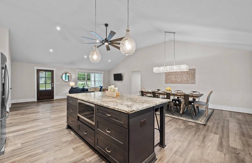 Kitchen- Fully stocked, granite counters, kitchen island with seating for four, dining room table with seating for 10.