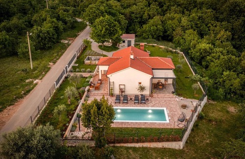 Villa Bogondon is, as the name suggests, a God-given jewel in the middle of a green, picturesque and peaceful landscape, offering a unique experience of Istria. The villa is a combination of tradition and modern comfort and was created by decorating an old house from the first half of the 20th century. It is furnished by combining handmade items, quality materials and modern trends. It has 2 bedrooms (one with a double bed and the other with two single beds that can be connected if necessary) and two bathrooms, as well as a kitchen, dining room and living room that form one unit, terraces (uncovered and covered) and a garden for socializing, but also corners for solitude, a tavern with an original Istrian fireplace and a bay surrounded by olive trees and aromatic herbs.Villa Bogondon is located in Tomovi, 5 km from Labin and 10 km from Rabac and beautiful blue pebble beaches.