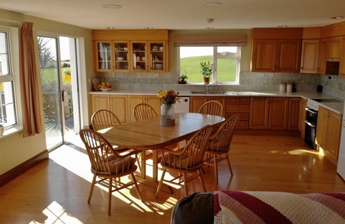 Our home has a spacious, bright open plan kitchen/dining area (70sqm). It opens out to a patio with outdoor table and chairs. Oak flooring throughout kitchen/dining and sitting rooms. Corian worktop in kitchen with double bowl stainless steel sink and drinking water tap. Dishwasher, electric cooker with glass hob, microwave, and fridge/freezer. Plenty of kitchen crockery, utensils, pots and pans. Kitchen cabinets with two large pull out drawer units. Pull out waste bin.