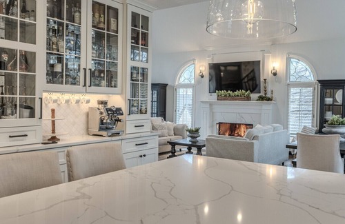 Step inside the foyer and be greeted by soring ceilings, gleaming hardwood floors, and an abundance of natural light. Unwind in the spacious living room, featuring a crackling fireplace, and plush furnishings that invite relaxation. Prepare gourmet meals in the chef's kitchen boasting commercial grade appliances, pristine 10 foot quartz island, and DeLonghi espresso machine.