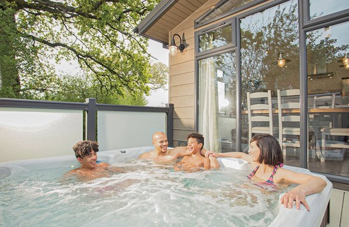 Stunning luxury lodge. Two king-size doubles, both with contemporary styled en suite shower, and one spacious twin. Stylish bathroom with bath and overhead shower. open-plan living space with lounge, stylish kitchen, breakfast bar and spacious dining area. French doors opening on to decking area with outdoor hot tub. Ideal for a luxury escape with friends or family. Pets allowed in selected accommodation only.